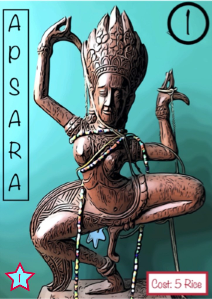 Apsaras, celestial nymphs, were created during the Churning of the Sea of Milk. Their beauty could seduce the gods. Kambu, the mythical patriarch of the Cambodian people, married an Apsara named Mera –something of a Cambodian Adam & Eve legend.
